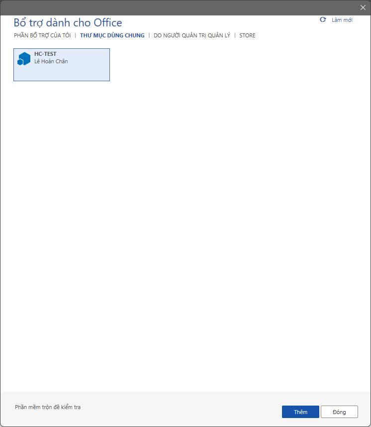 Trong hộp thoại Bổ trợ dành cho Office (Office Add-ins) chọn mục Thư mục dùng chung (Shared Folder) và chọn HC-TEST rồi nhấn nút Thêm (Add)