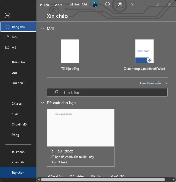 Trong Word, vào Tab Tệp (File) rồi Click vào mục Tùy chọn (Option)