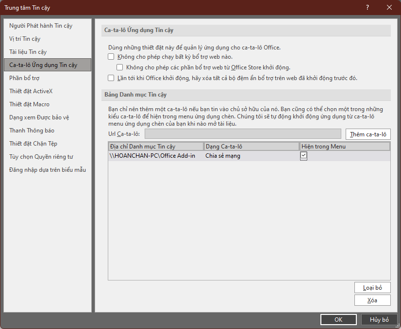 - Click mục Ca-ta-lô Ứng dụng tin cậy (Trusted Add-in Catalogs)