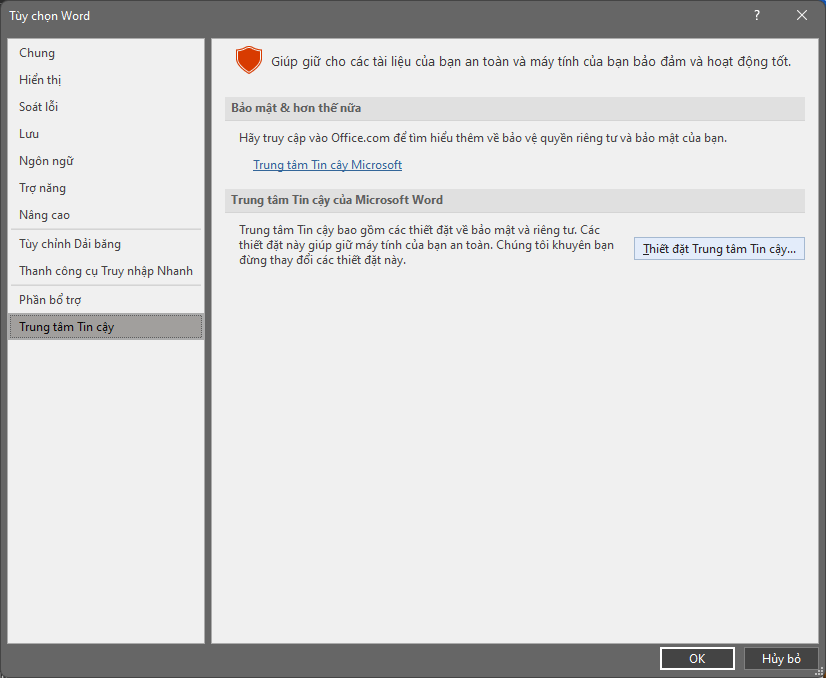 Ở cửa sổ Tùy chọn Word được mở ra, chọn Trung tâm tin cậy (Trust Center), Click vào nút Thiết lập trung tâm tin cậy (Trust Center Settings)